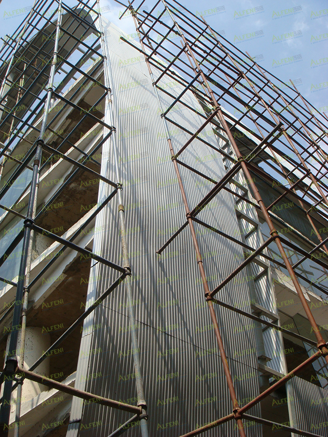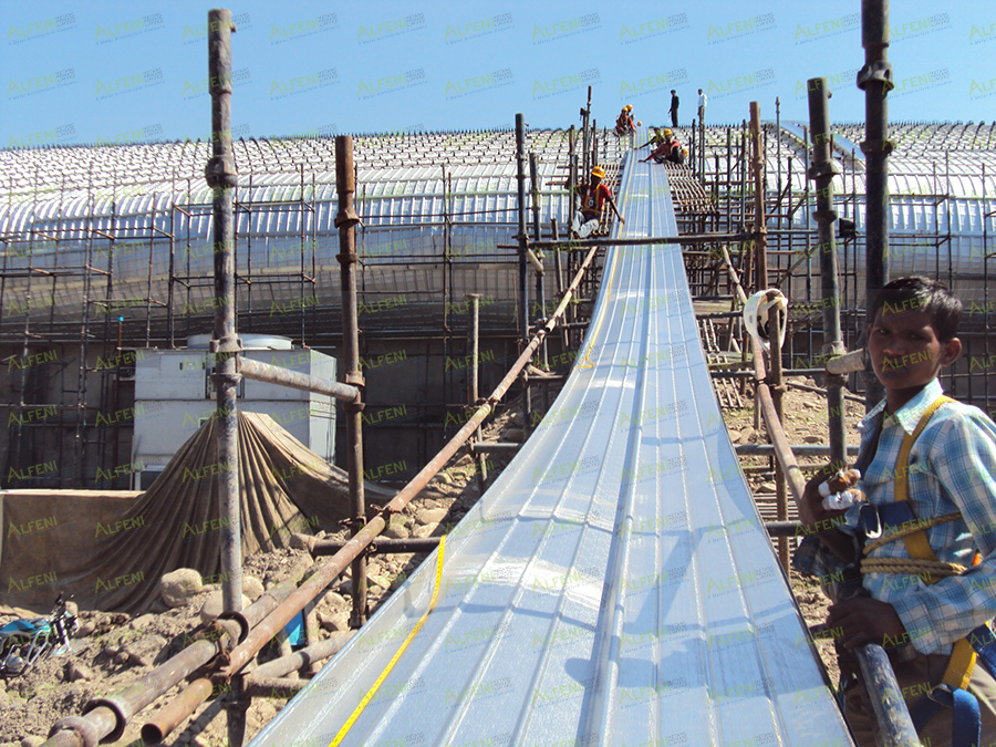Alfeni offers Aluminium & ZINC standing seam roofing & Cladding systems. These sheets are available in cover widths of 300, 400 and 500 mm, providing a very cost effective way of finishing roofs and also allowing laying of the sheets to take place from both ends of the roof simultaneously. It also allows designers the freedom to choose the module width or even to mix widths on a single roof. The side laps of the panel feature a zip-up standing seam detail, which hooks over a series of halters, to provide a continuous weather tight roof without any through fixings. The product can be manufactured on or off-site to almost any length, which virtually eliminates the need for end laps.